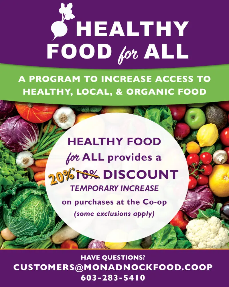 Monadnock Food Co-op is a cooperatively and community-owned grocery store with a focus on local, organic, natural, fair trade, and sustainably grown foods. All are welcome to shop at our store! Take part in shaping the local economy and supporting local food systems by becoming a Member-Owner of the Co-op!