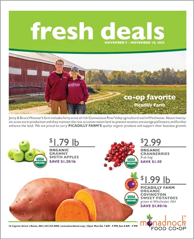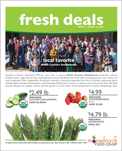 Named NH Business of the Year by Business NH Magazine in 2024, Monadnock Food Co-op is a proud supporter of the Monadnock region. Based in Keene, NH, we also serve the surrounding towns of Peterborough, Swanzey, Chesterfield, Jaffrey, Rindge, Walpole, and the greater Cheshire County area. Monadnock Food Co-op, where good, local food is just the beginning.