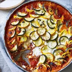 3.Tip the ratatouille into an ovenproof dish, then completely cover it with the cheese sauce. Spread the shredded Sky Ranch and arrange the squash slices on top in concentric circles, alternating between green and yellow if you have them. Can be assembled several hours before cooking.