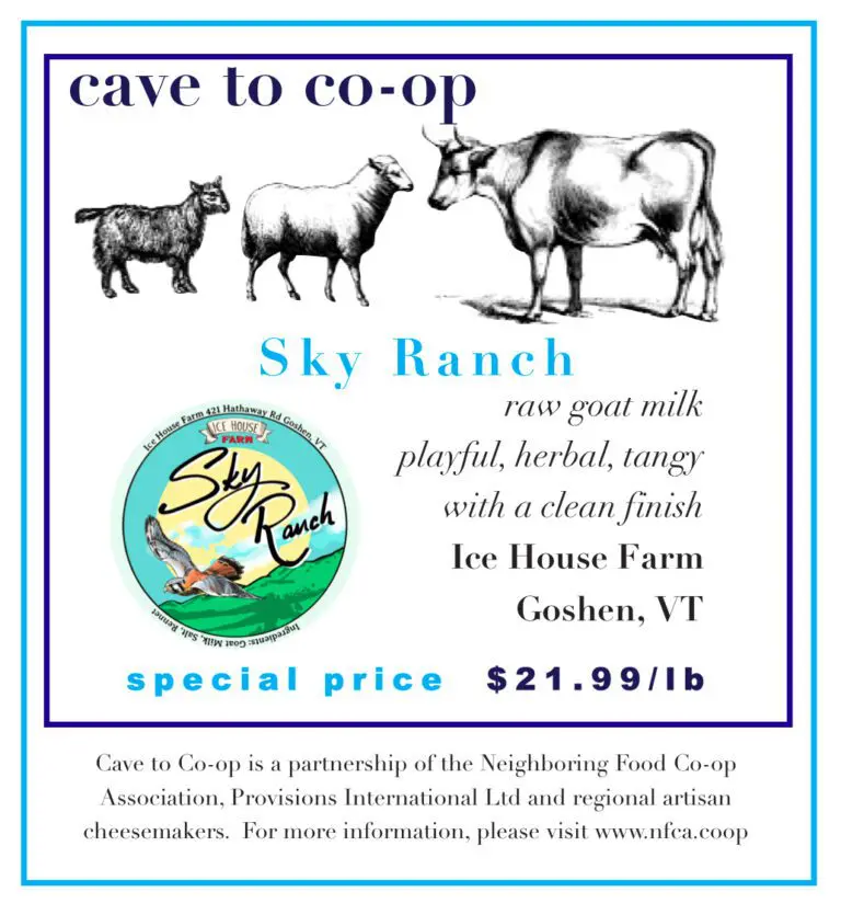 Our Cave to Co-op for August 2023 is Sky Ranch raw goat milk cheese from Ice House Farm in Goshen, Vermont.
