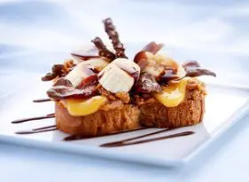 5. Meanwhile, heat chocolate sauce until warm. Dip each slice of bacon into warm chocolate to cover half of strip and place over bananas. To serve, drizzle with additional chocolate sauce.