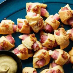 4. Unroll the dough on a cutting board and cut into 8 long triangles with the short side being 1½ inches long and the long sides being about 5-6 inches. Stack two pieces of ham, Unroll the dough on a cutting board and cut into 8 long triangles with the short side being 1½” long and the long sides being about 5-6″. Stack two pieces of ham, ¼ tsp of the caramelized onions, and 1 piece of Mt. Alice across the tip end of each triangle, roll up in the dough and place seam-side down on the prepared baking sheet. Top each finished roll with a dab of the remaining caramelized onions. teaspoon of the caramelized onions, and 1 piece of Mt. Alice across the tip end of each triangle, roll up in the dough and place seam-side down on the prepared baking sheet. Top each finished roll with a dab of the remaining caramelized onions.