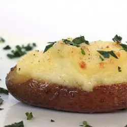 7. Spoon the stuffing into the potato skins and transfer to a baking sheet. Top each potato half with a slice of the remaining cheese. Bake the potatoes in the upper third of the oven for 12 minutes, until they are hot throughout and the cheese is melted. Cool slightly and serve.