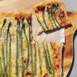 3.Smear the puff pastry with the honey dijon, leaving about ½” border around the edge for the crust. Add the caramelized onion jam on top. Add the grated Pawlet on top of the mustard and onion jam. Add the asparagus and sprinkle the whole thing with cheese.