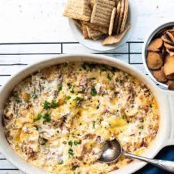 2. In a large bowl, combine cream cheese, corned beef, Baby Swiss cheese, sauerkraut, sour cream, and dressing and mix well. Spread into prepared dish and bake until hot and bubbly, about 15 to 20 minutes. Serve with crackers or chips.