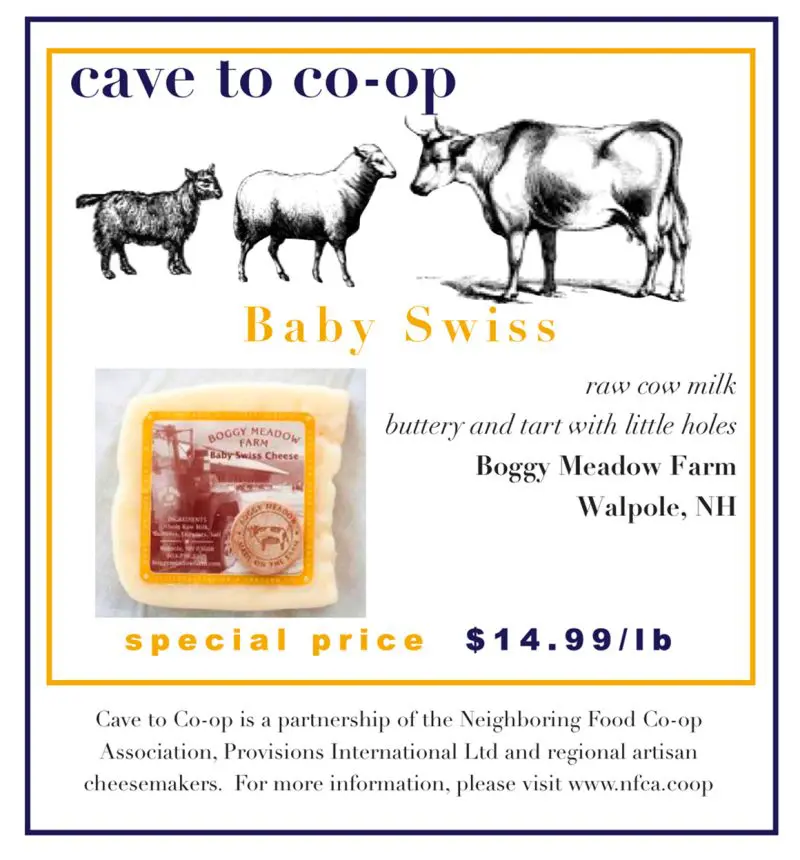 Our Cave to Co-op for June 2023 is Baby Swiss from Boggy Meadow Farm in Walpole, New Hampshire.