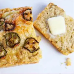 6.Pour the remaining butter over the batter and top with the remaining Rupert and the jalapeño slices.