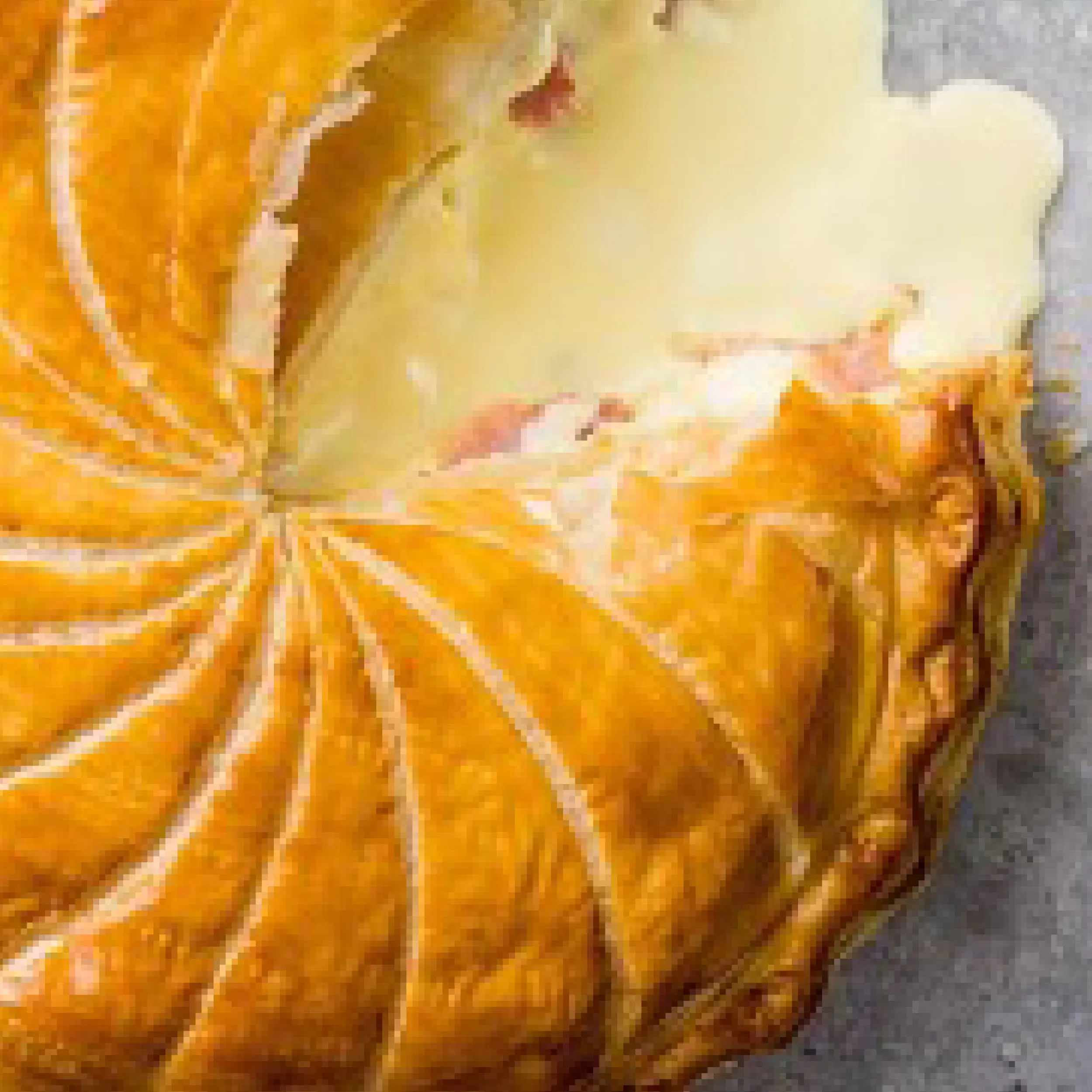 2. Heat the oven to 400ºF. Halve the pastry and roll into two 9 inch circles. Put one piece on a baking sheet and spread over the mustard in a 7-inch circle. Lay the ham on the mustard. Flip the set cheese out of its tin, remove the cling film and sit it on the ham. Brush the border of the pastry with egg then drape the second piece of pastry on top. Press around the cheese and ham, eliminating any air. Trim the edges then crimp to seal. Brush all over with some egg then put in the fridge for 10 minutes. Take the galette out and use the back of a knife to score a border ½ inch from the edge, then score lines from the center to the border to create a pattern. Glaze with egg again.