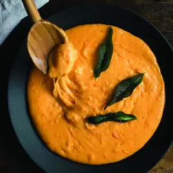 2.Meanwhile, fry the sage leaves: Line a plate with a paper towel. In a small skillet, heat 1/4-inch of oil. Add sage leaves a few at a time, and fry until golden and crisp, usually about 1 minute or so. Use a slotted spoon to transfer fried leaves to the paper- towel-lined plate and sprinkle with salt. Repeat with remaining sage leaves, adding more oil to the pan if needed.