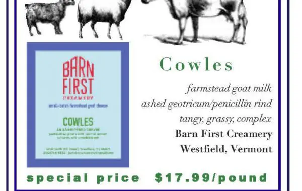 Our Cave to Co-op for October 2020 is Cowles—a 100% pasteurized farmstead goat-milk soft cheese—from Barn First Creamery in Westfield, Vermont. Cowles,…