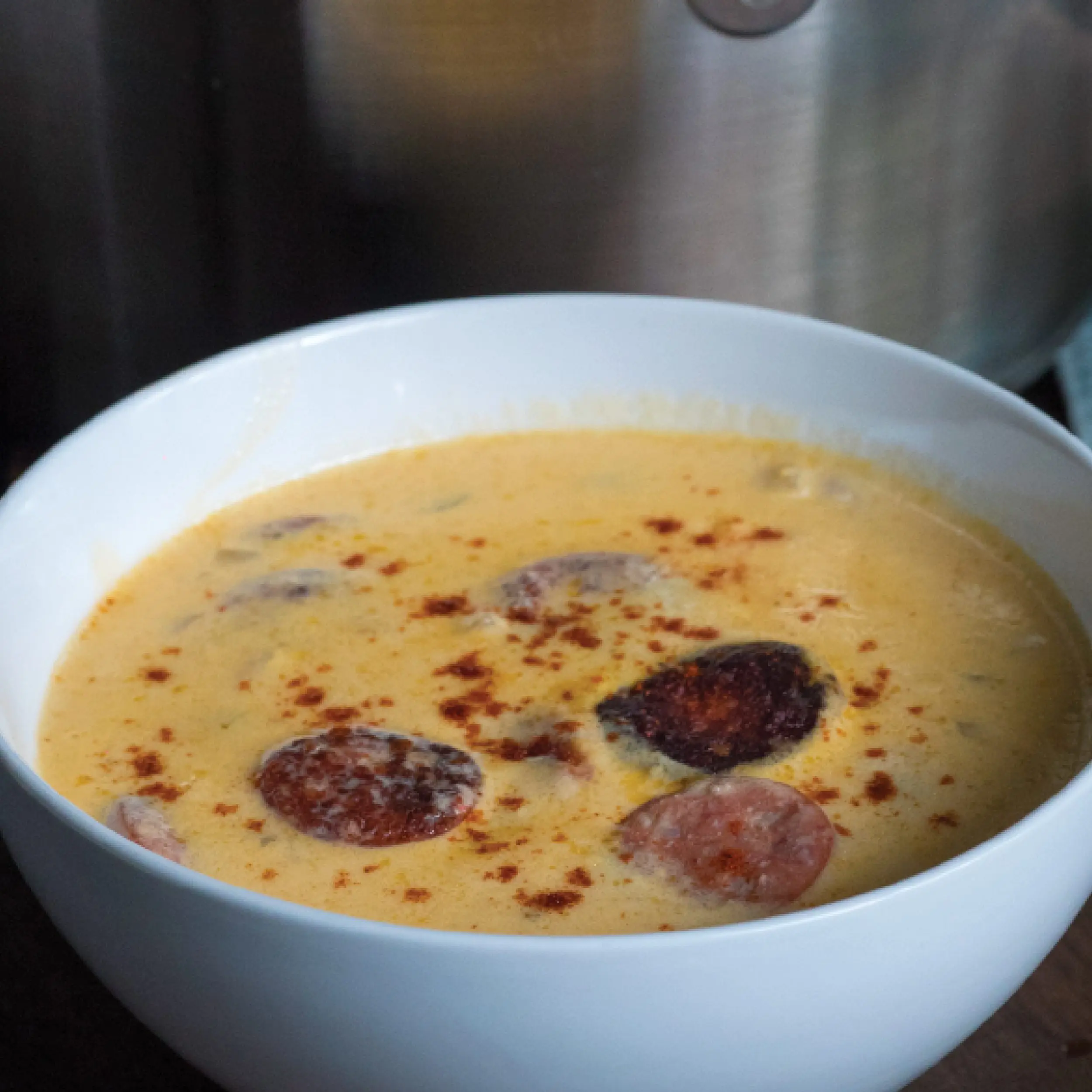 10.Divide soup between bowls and top with sausage and a sprinkling of paprika.