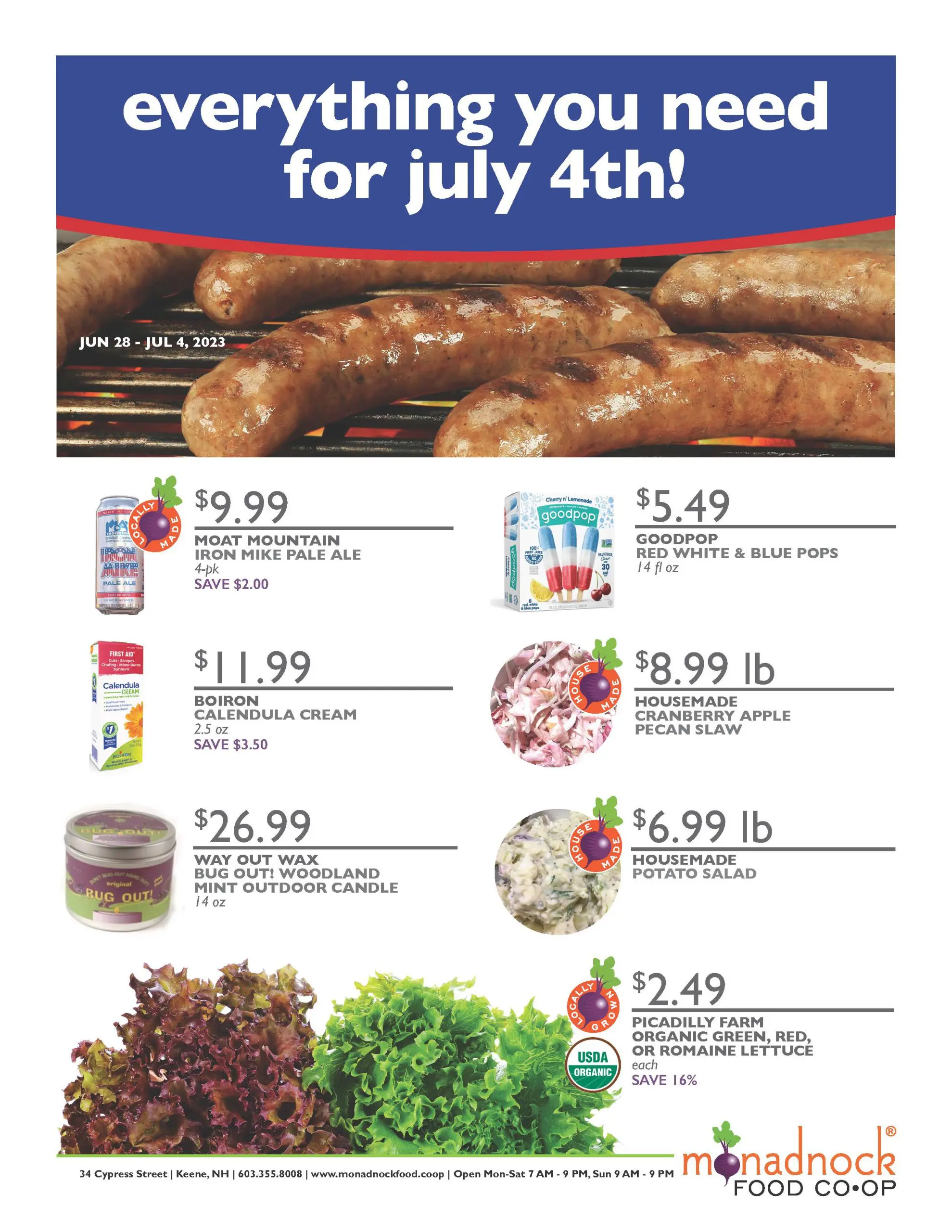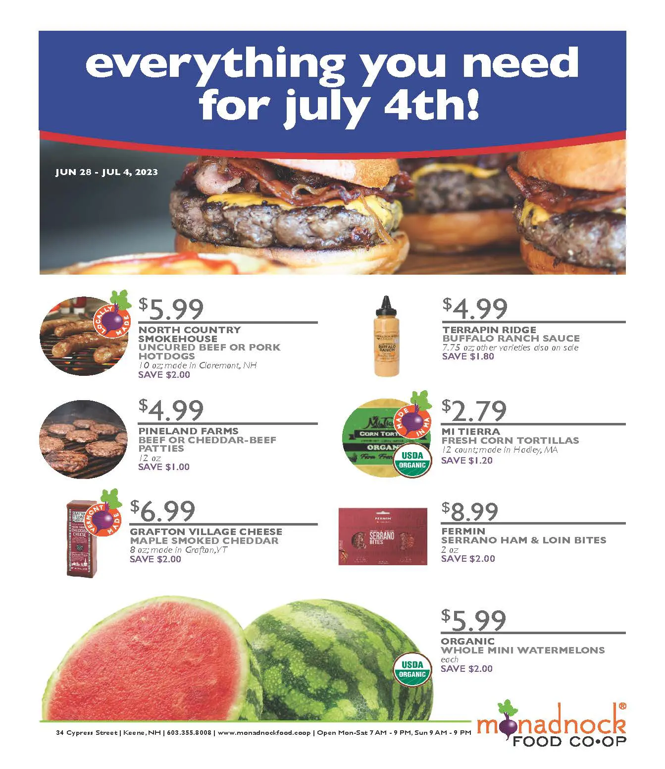 Get ready for a festive July 4th by grabbing some sizzling hotdogs or succulent hamburger patties for the grill. Don’t miss out on the opportunity to enjoy whole mini watermelons, the perfect addition to your celebration. Take advantage of the sale on locally brewed MOAT MOUNTAIN Iron Mike Pale Ale and make sure not to overlook the delectable housemade potato salad.