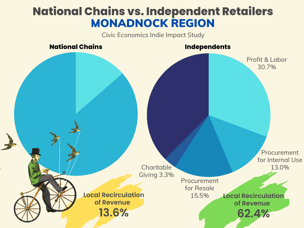 Independents Month, part of the American Independent Business Alliance’s (AMIBA) Shop Indie Local Initiative, is the perfect time to shine a light on the Local Multiplier Effect and the Monadnock Indie Impact Study. Together, we’ll inspire our communities to take positive action and boost the positive ripple effects our neighborhoods, towns, and cities receive when we spend more of our dollars at locally owned, independent businesses.
