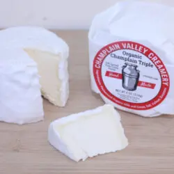 Champlain Valley‘s Triple Crème is crafted from certified organic, grass-fed Jersey milk with traditional techniques in a solar-powered facility. Their signature offering, the Organic Champlain Triple, is a sumptuous soft-ripened triple crème cheese — made from cultured whole milk and cream, ladled by hand into blocks and aged for roughly 10 days. It has a rich, buttery interior and a delicate, bloomy white rind, giving off subtle mushroom and earth notes. Triple Crème pairs well with sparkling wines, crisp dry cider, or barrel-fermented Chardonnay, and would be a luxurious addition to any cheese board, accompanied by honey or fig chutney, quince paste, and fresh apples.