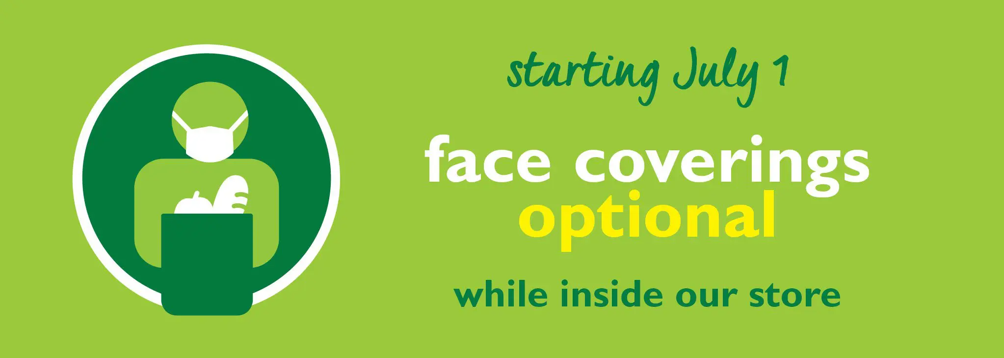 Starting July 1st, face coverings for customers are optional. While customers are welcome to choose whether or not to wear a face covering, note that weβll no longer provide free face coverings — so please bring your own.
