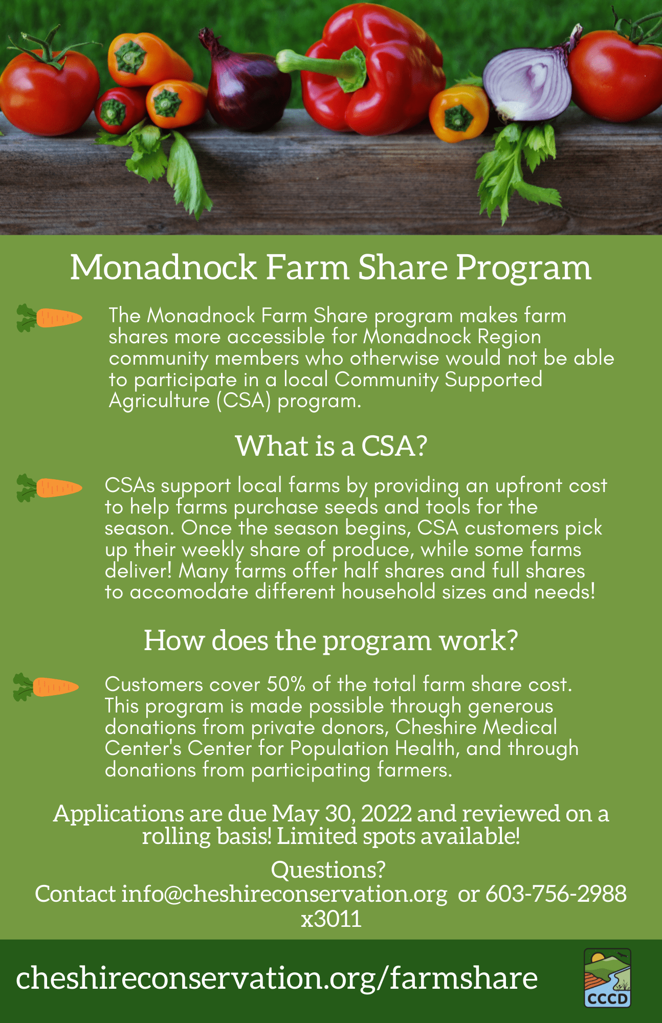 The Monadnock Farm Share program makes farm shares more accessible to limited-income community members who otherwise would not be able to participate in a local Community Supported Agriculture (CSA) program.