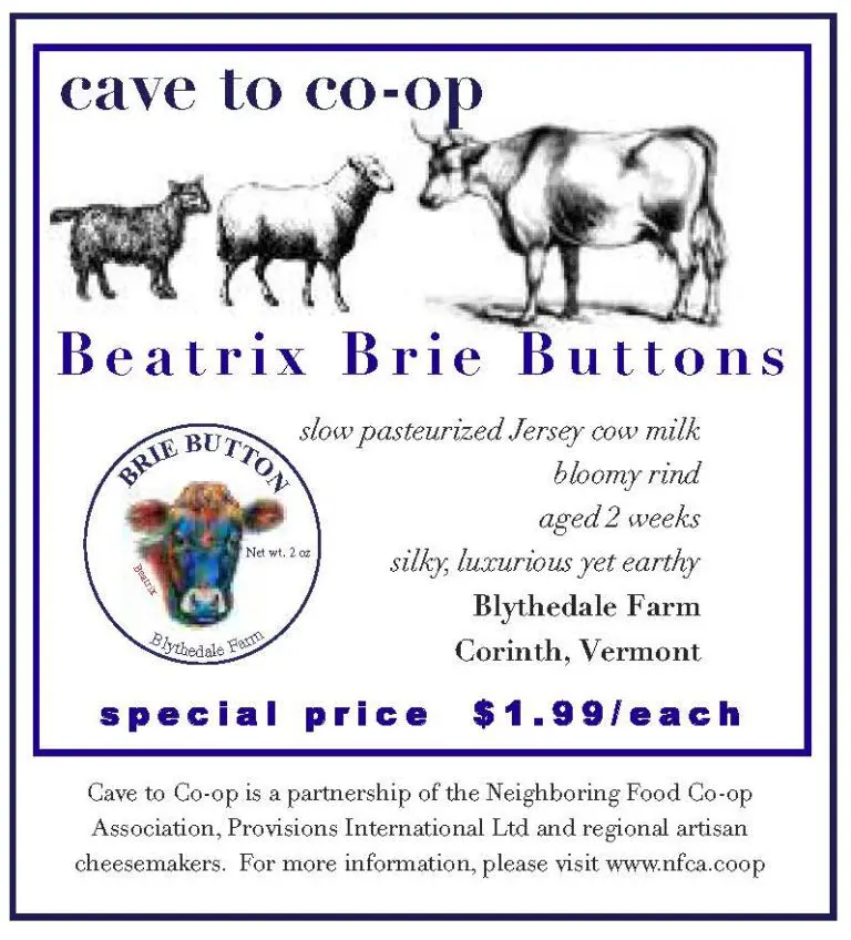 Our Cave to Co-op for January 2020 is a petit brie cheese from Blythedale Farm in Corinth, Vermont.