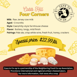 Our Cave to Co-op for January 2026 is Four Corners, a Welsh-style Cheddar, from Cobb Hill Cheese, Hartland, Vermont.