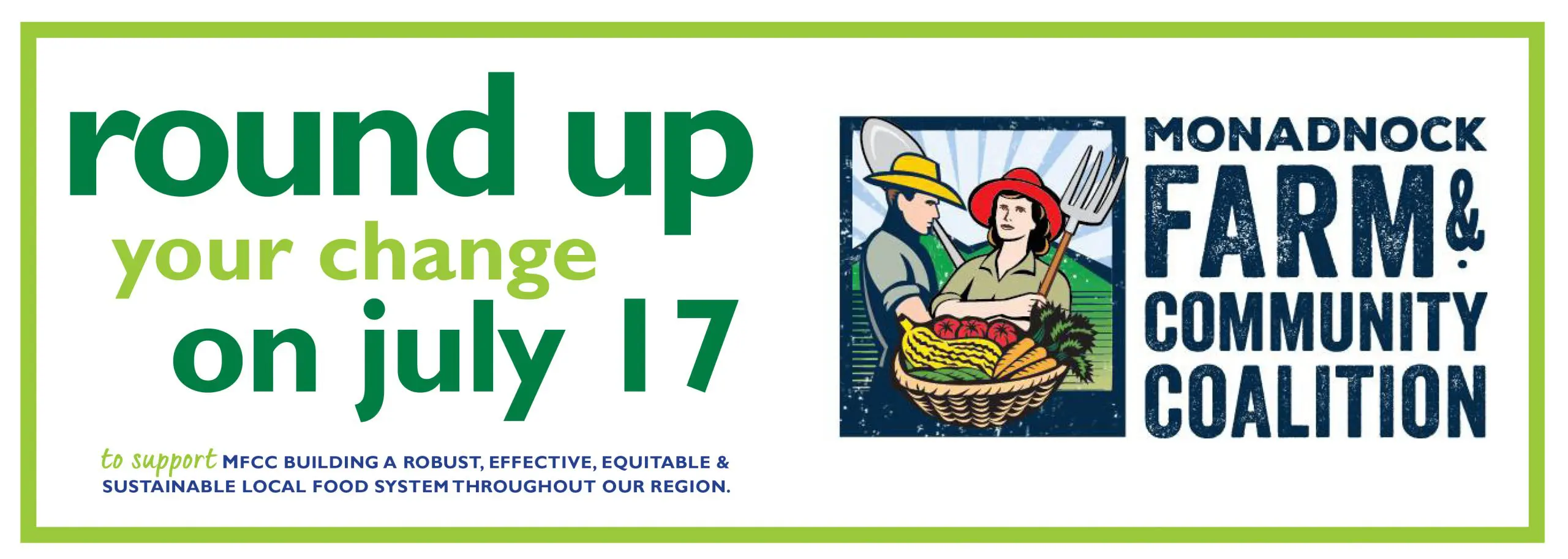 The Monadnock Food Co-op will launch a one-day Round It Up Donation Drive to benefit the Monadnock Farm & Community Coalition (MFCC) on July 17, 2021. The Co-op’s Round It Up program empowers shoppers to make positive changes in their community by donating their change to local community organizations.
