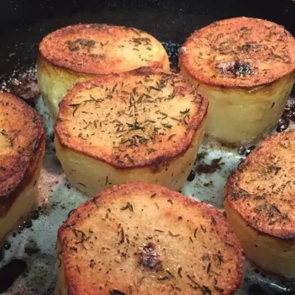 6.Flip the potatoes onto the opposite ends. As they cook, use a paper towel held with tongs to carefully blot out the oil from skillet. Add butter and thyme sprigs to skillet.