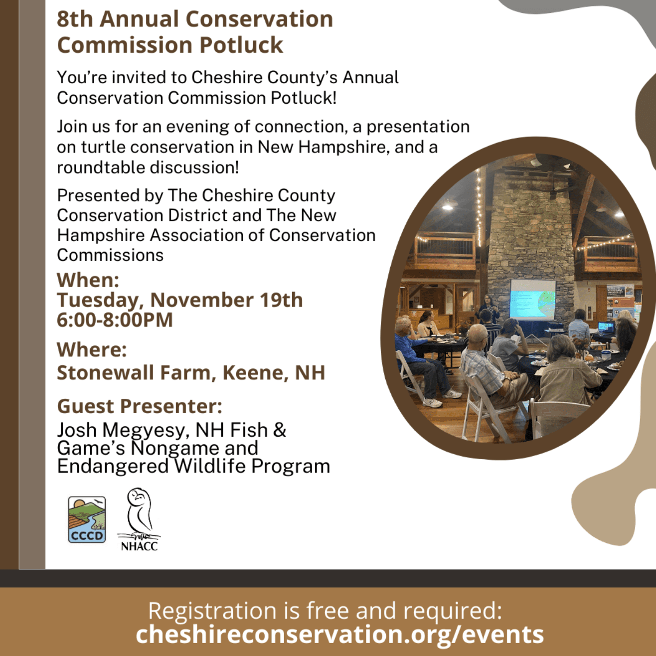 You’re invited to Cheshire County’s Annual Conservation Commission Potluck! Join us for an evening of connection, a presentation on turtle conservation in New Hampshire, and a roundtable discussion! Conservation Commission members and the general public are invited to join the Cheshire County Conservation District and the NH Association of Conservation Commissions for an exciting evening at Stonewall Farm! Join Josh Megyesy from New Hampshire Fish & Game’s Nongame and Endangered Wildlife Program for a discussion on at-risk turtle conservation and the role research and monitoring has played in guiding those efforts. His talk will cover basic ecology, habitat preference, threats, and how research is conducted. Josh will discuss the conservation actions necessary for the continued existence of rare turtles, the tools available to help, the importance of citizen science, and the federal, state, municipal, NGO, and private partnerships needed to make it all happen. About Josh: Josh Megyesy is a wildlife biologist with the New Hampshire Fish & Game Department’s Nongame and Endangered Wildlife Program. Since joining the Program in 2014, Josh has conducted research and monitoring for at-risk turtle populations including Blanding’s, wood, spotted, and eastern box turtles. His work has been critical in identifying priority populations and conservation areas where he has focused efforts on land protection, habitat management, and technical assistance/Best Management Practices to private landowners and land managers. Josh also works with regional partners to develop conservation strategies, outreach materials, and coauthors scientific publications. Beyond turtles, he also helps coordinate the Reptile and Amphibian Reporting Program and works with other state-listed reptile and amphibian populations. This event is a collaboration between the NH Association of Conservation Commissions, the Cheshire County Conservation District, and Stonewall Farm. | When: 6:00PM: Arrival and Drop off Dishes 6:10PM: Presentation: At-risk Turtle Conservation in New Hampshire – Using Science and Partnerships to Protect a Declining Taxa 7:30-8:00PM: Round Table Discussion on the Role of Conservation Commissions in Turtle Conservation. | Attendees are asked to bring a dish to share for the evening’s potluck if they can. NHACC and CCCD will also provide some locally sourced snacks. Presented by Cheshire County Conservation District (CCCD) and New Hampshire Association of Conservation Commissions (NHACC) Cost: Free, Registration Required Please Note: Pets are not allowed at CCCD events. Service animals trained to to aid a person with a disability are welcome. Accessibility: Stonewall Farm does not have an elevator on site, but does have a vehicle drop off space available to access the second floor for limited mobility individuals. For questions about accessibility please contact Stonewall Farm directly at 603-357-7278. For questions or assistance in registration contact: Email [email protected] or call (802) 518-0993.
