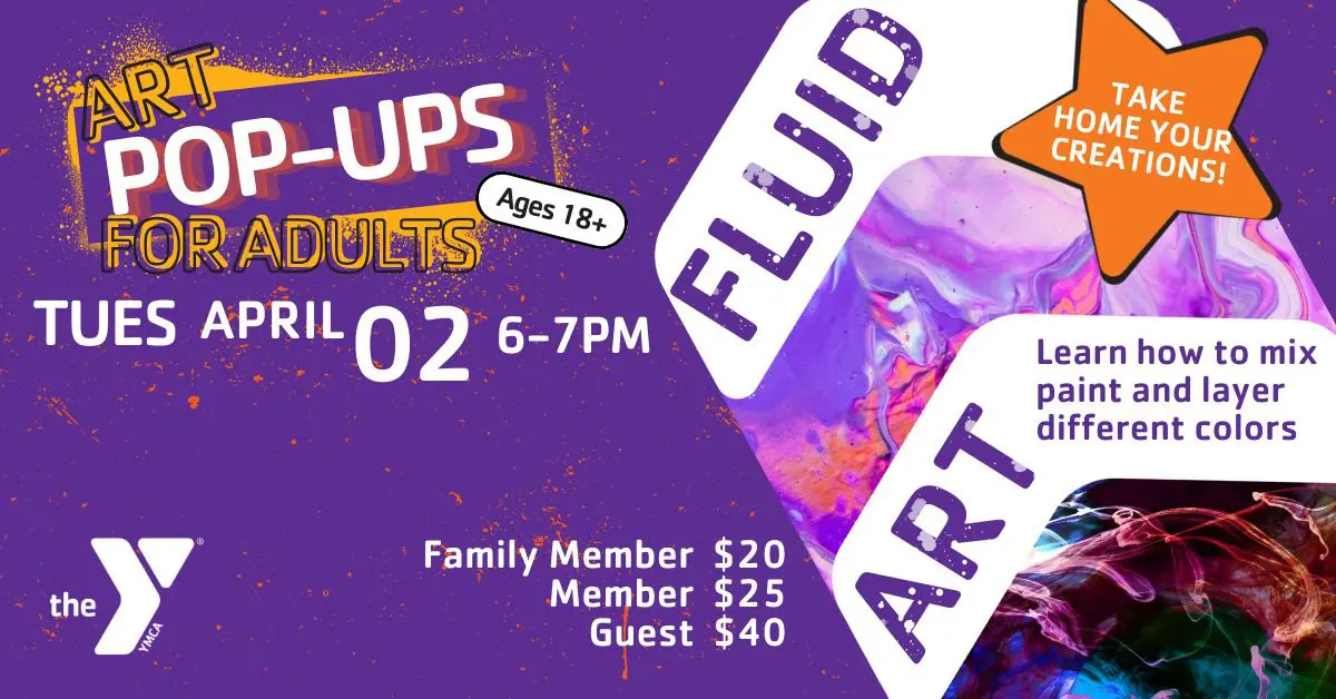 Our spring series of Adult Arts Pop-up Classes continues with Fluid Art! Learn how to mix paint and layer different colors to create your own unique pattern on canvas.