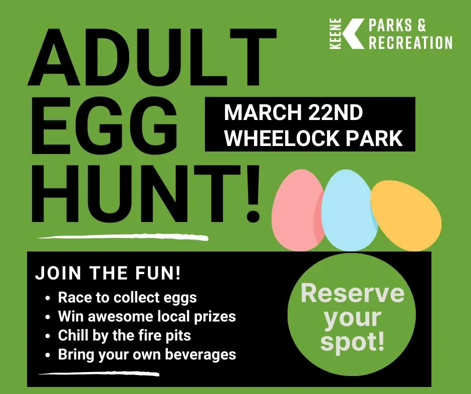Mark your calendars for an Adult Egg Hunt! Ages 21+ can register to participate in this event at Wheelock Park on March 22nd, from 6-8pm. We’ll have fire pits going as we wait for the sun to set and the beer garden will be open if you choose to bring your own beverages. At sunset, everyone will race to find the most eggs for a chance to win some awesome prizes from local businesses! Register at the link below!