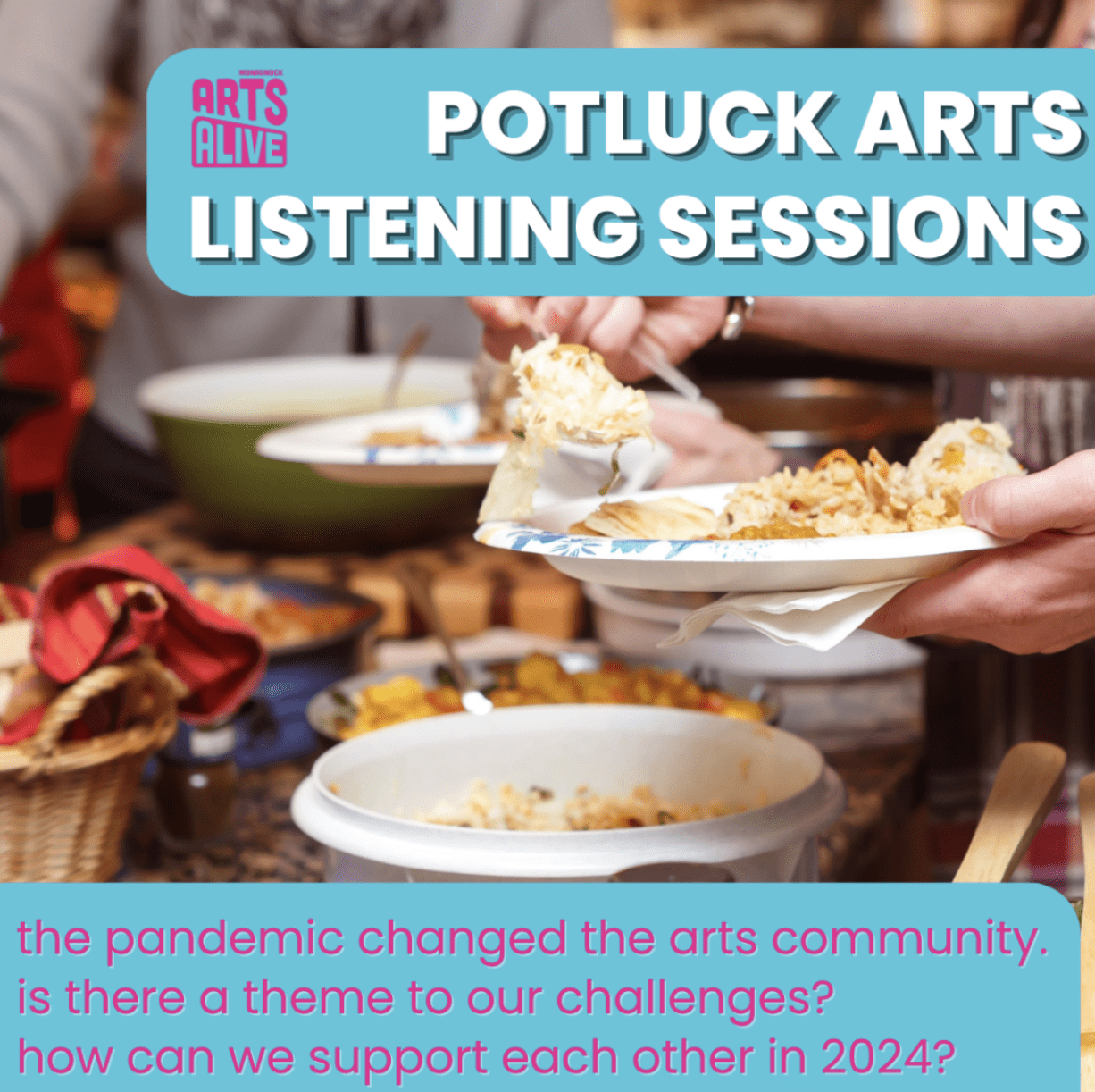 This year, Arts Alive is holding a series of community Potluck Listening Sessions to connect and hear everyone’s stories and to envision how we can tackle any challenges together. We’re particularly focusing on how things have changed in the arts world following the pandemic.