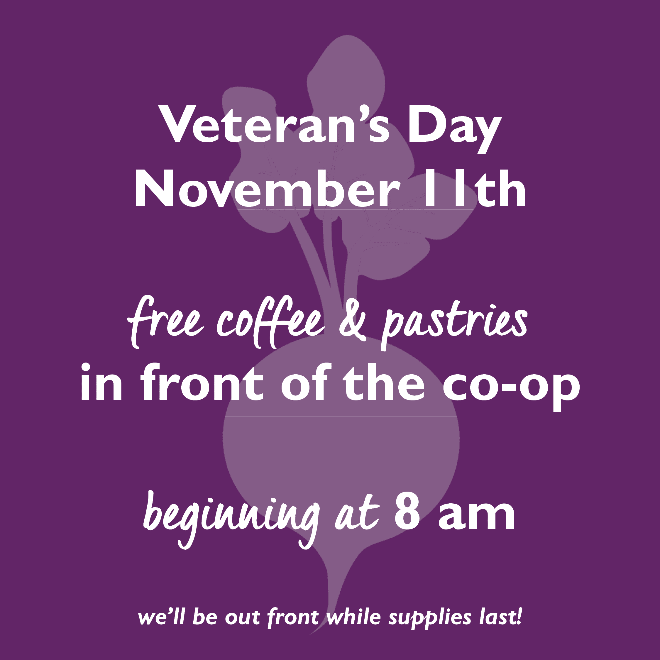 Monadnock Food Co-op will honor our local veterans this year on Veteran’s Day, November 11th. We will be out front of the co-op beginning at 8 a.m., providing free coffee and pastries for veterans. No proof of service is required. We will be out front until supplies run out!
