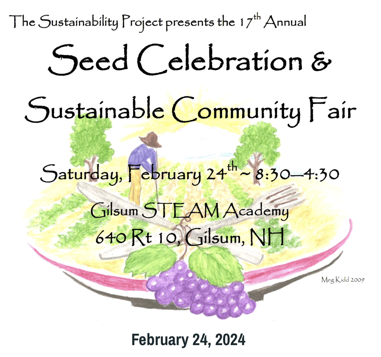 Come for the day, or just an hour, to celebrate the miracle of seeds and gardening with The Sustainability Project, now in its 24th year. Farmers, gardeners, and activists working for sustainable and regenerative ways of living on the planet have come to know this event as a great opportunity for joyful networking. Participants will have the opportunity to receive support planning their gardens, stock up on seeds and to dance! There will be lunchtime music and a café featuring soups, stews and baked goods from local restaurants and kitchens, including Orchard Hill Breads, to nourish all. As customary, a bountiful raffle has been made possible by generous local businesses. Children’s activities will be offered throughout the day.
