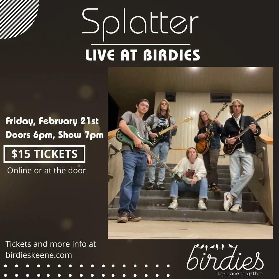 « All Events This event has passed. Splatter – Live at Birdies! February 21 @ 7:00 pm - 9:00 pm « Elinor Williams Hooker Tea Talks 2025: The Art of War – Panel #3 Yoga & Tea at Birdies » Add to calendar Google Calendar iCalendar Outlook 365 Outlook Live Details Date: February 21 Time: 7:00 pm - 9:00 pm Event Category: Community Event Website: https://www.facebook.com/profile.php?id=61561343436132 Venue Birdies on Main 18 Main Street Keene, NH 03431 + Google Map Organizer Birdies on Main View Organizer Website