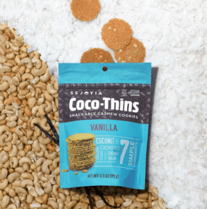 SEJOYIA means SEE JOY IN ALL — in what you eat, what you do, how you live. This company sees joy in their COCO-THINS ingredients displayed proudly on the FRONT of the package. That’s right. They want to be sure you see the simple Paleo-friendly & gluten-free ingredients that make up these very snackable cookies 😋 VANILLA COCO-THINS are made from Organic Coconut, Cashews, Organic Coconut Sugar, Cassava Flour, Sea Salt, Natural Vanilla Flavor, and Organic Natural Almond Flavor. And what is caasva, you ask? According to Sejoya, it’s the holy grail of grain-free cooking! Cassava is a root vegetable (think yam or plantain) popular in Latin America, Asia and Africa. It also happens to be gluten, grain and nut free, not to mention vegan and paleo.