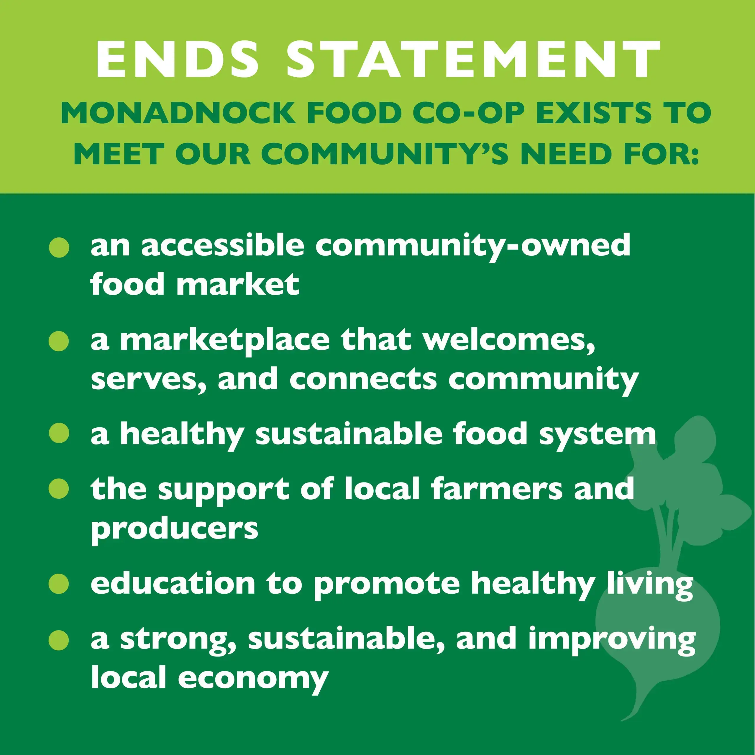 Monadnock Food Co-op exists to meet the community’s needs for: