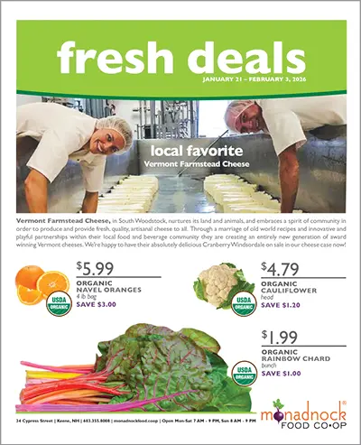 Named NH Business of the Year by Business NH Magazine in 2024, Monadnock Food Co-op is a proud supporter of the Monadnock region. Based in Keene, NH, we also serve the surrounding towns of Peterborough, Swanzey, Chesterfield, Jaffrey, Rindge, Walpole, and the greater Cheshire County area. Monadnock Food Co-op, where good, local food is just the beginning.