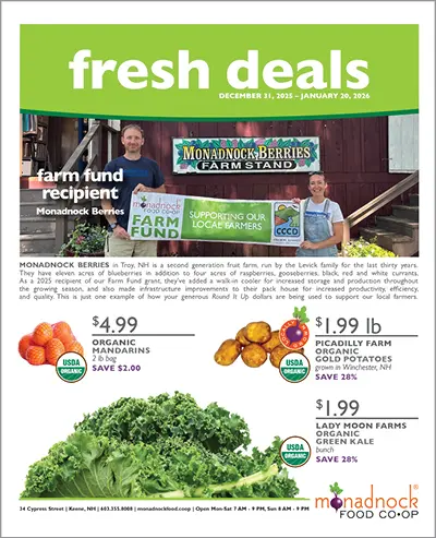 View our Grocery Store Sales & Discounts DEC 31 - JAN 20 DEC 31 - JAN 20 See Deals at Monadnock Co-op in Keene, NH Co+Op Basics Get your staple products at everyday low prices from our Basics program all year long. Learn more about Co+op Basics Flash Sales Watch for flash sales to get products at huge discounts usually for one day only. Learn more about Flash Sales Bulk & Case Discounts Purchase some of your products in bulk or special order cases for special discounts. Learn more about Volume Discounts Truckload Sales Watch for our annual spring and fall truckload sales with deep discounts on cases of our most popular items. Learn more about Truckload Sales Membership Discounts Get quarterly discounts as a perk of being an Owner-Member of our co-op. Learn more about Membership Discounts Bundle Buys Look for seasonal Bundle Buys offerings in our Meat & Seafood Department and Produce Department. Seasonal Bundle Buys